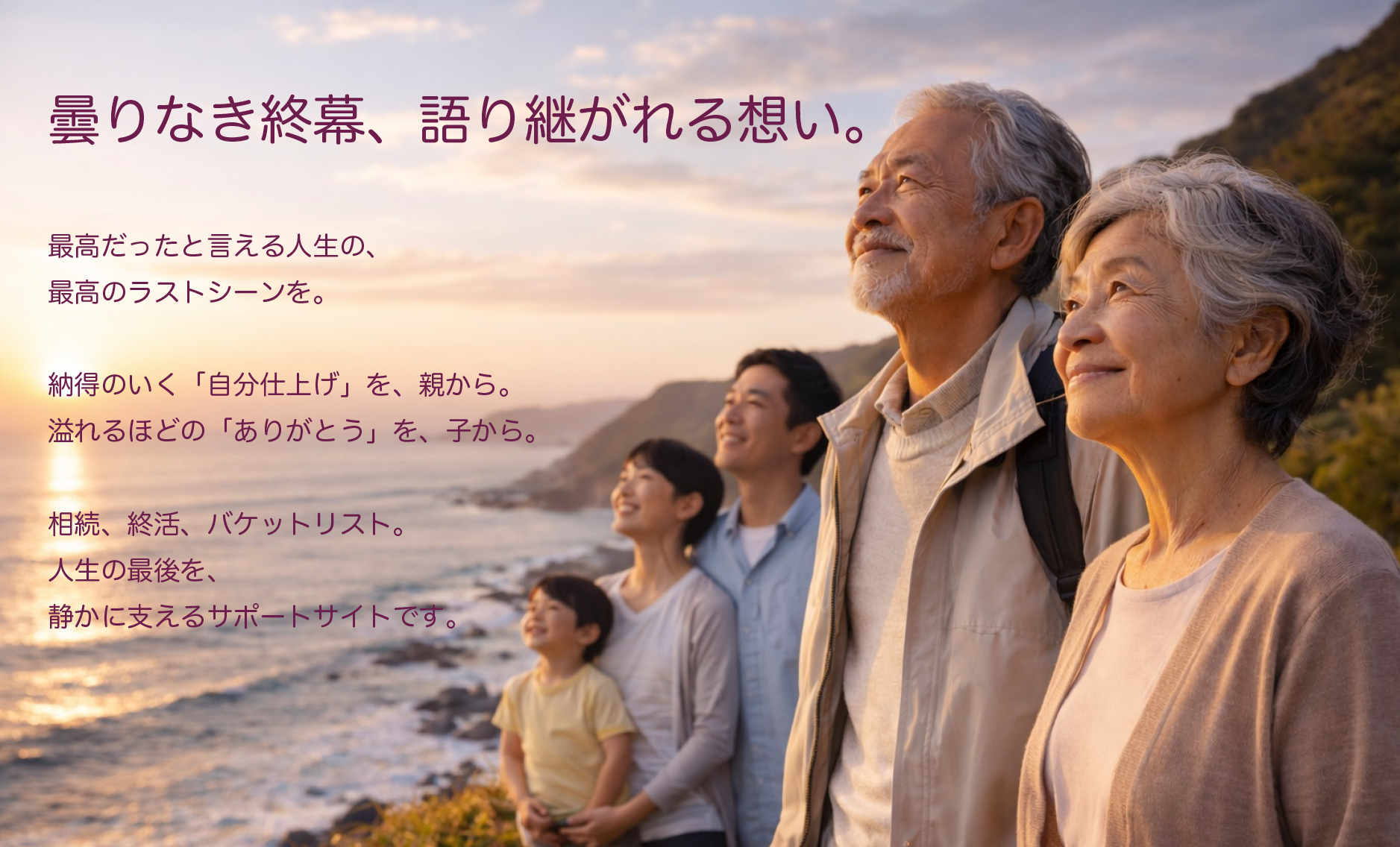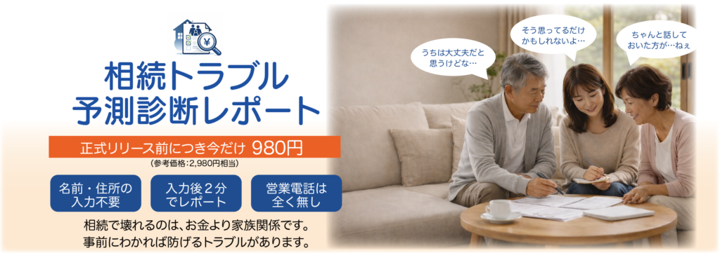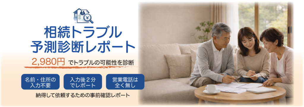 人生の終盤に起きる不安を、ひとつずつ解消するサービス ■ 相続トラブル予測診断レポート 👉 サービスはこちら ■ 遺品整理 費用目安レポート 👉 サービスはこちら 今後も、人生の最後を、より穏やかに迎えるための新しいサポートサービスも順次公開予定です。